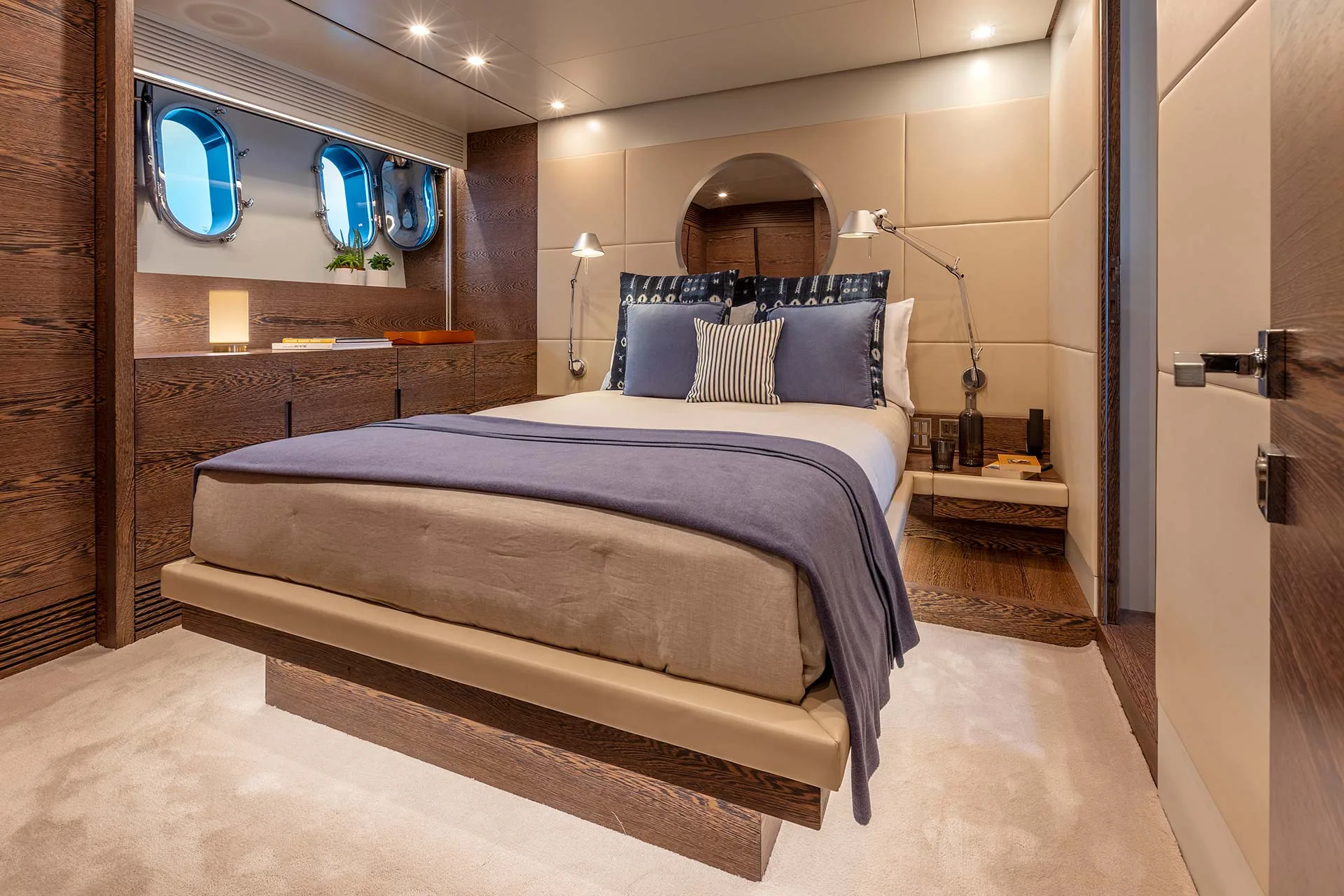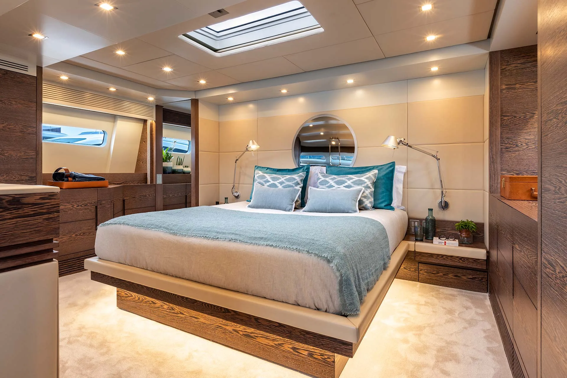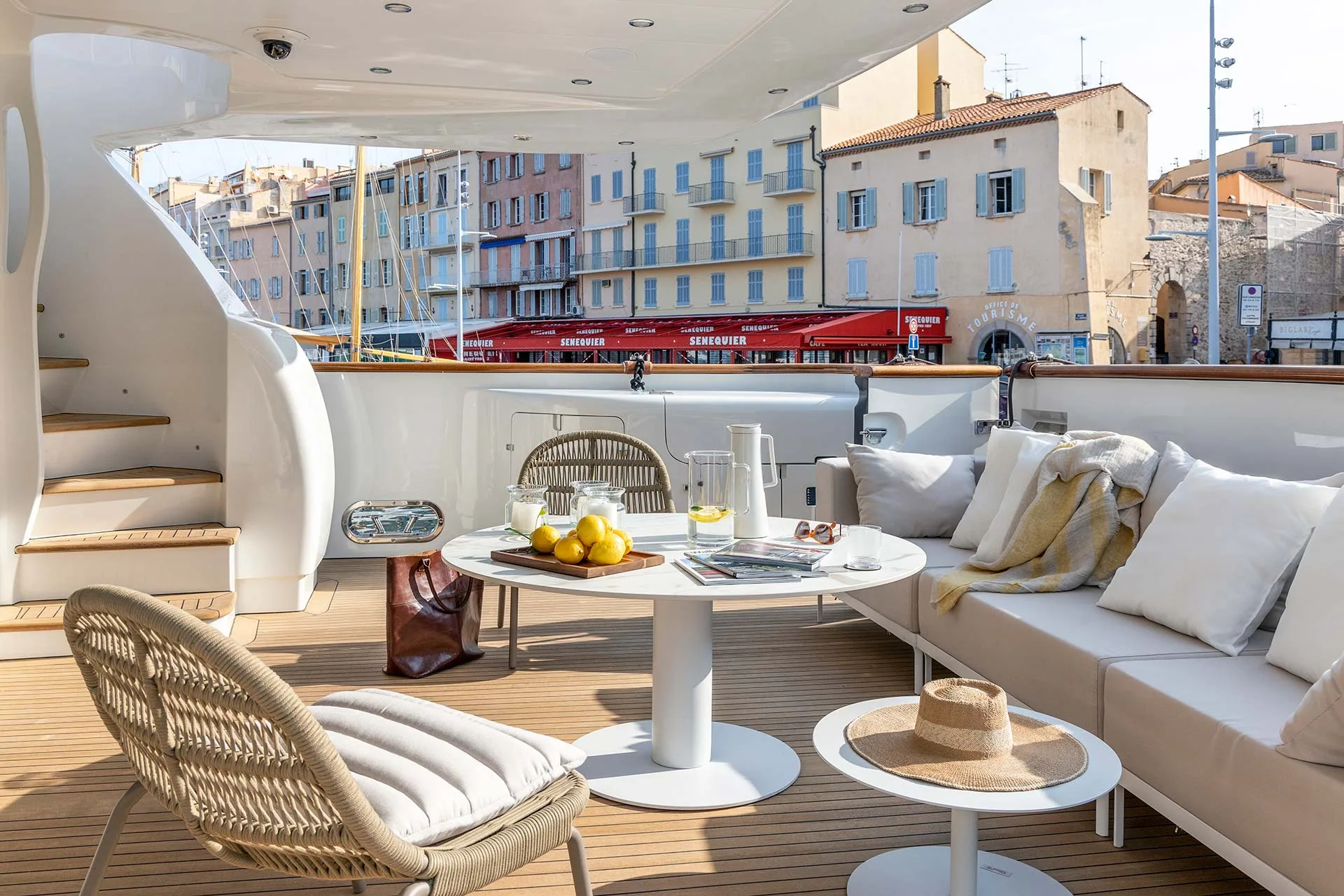 The flybridge features a spacious dining table and sunbeds, perfect for alfresco meals and lounging. Sheltered yet open to sea breezes, it offers stunning views and easy access to the main deck via a single stairway.
