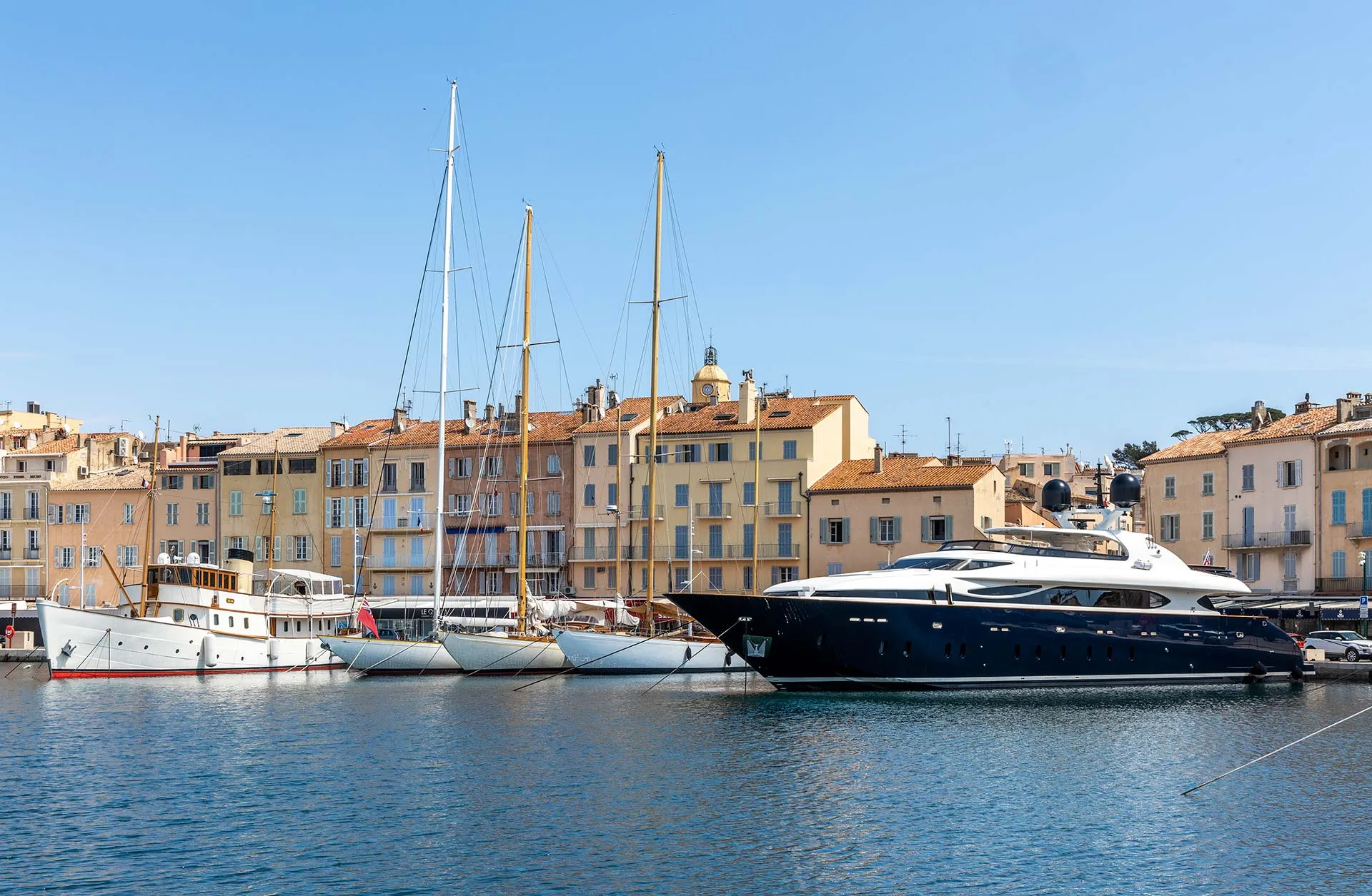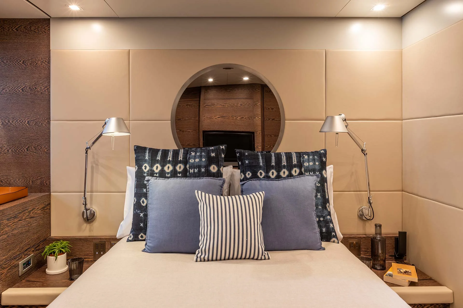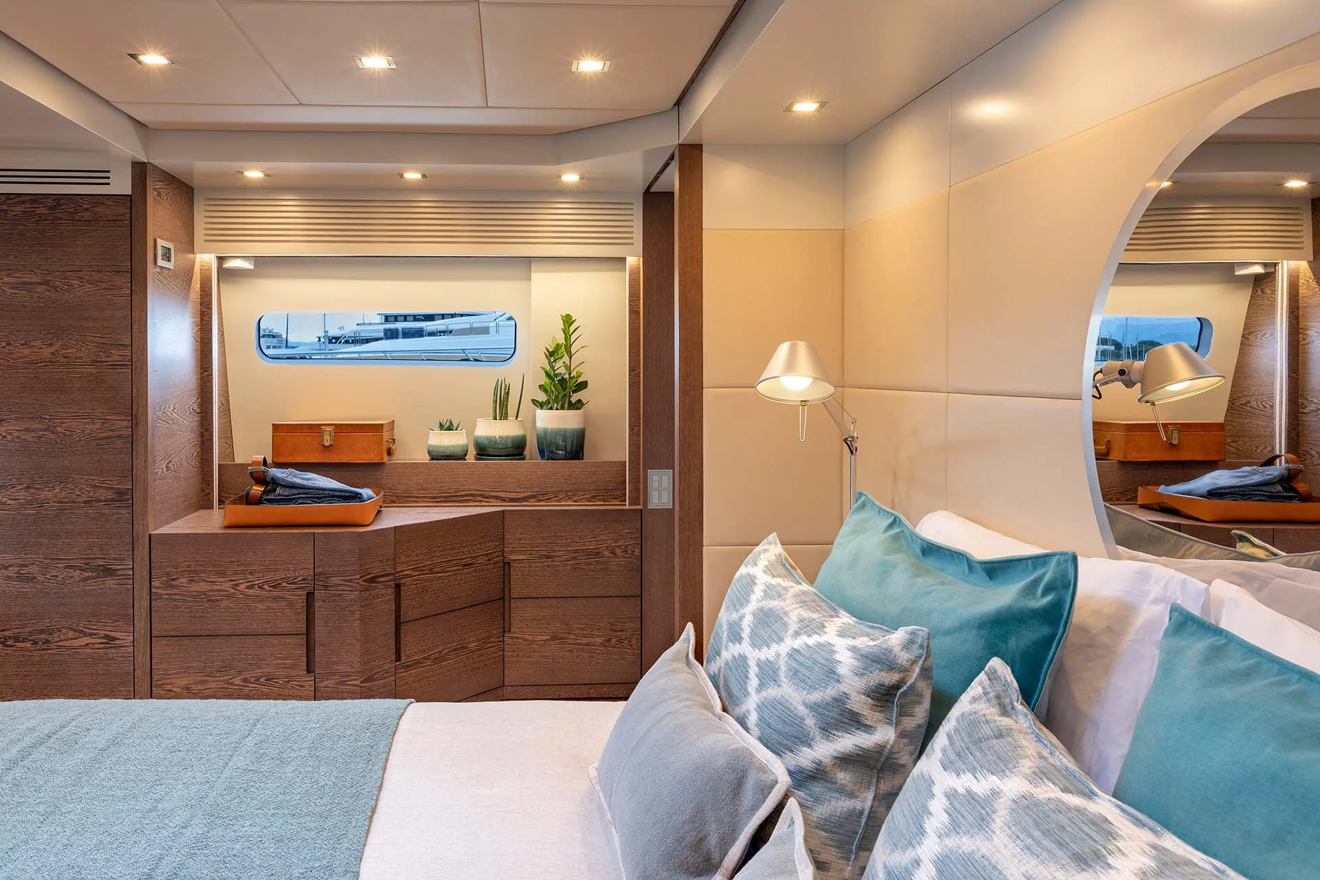 The flybridge features a spacious dining table and sunbeds, perfect for alfresco meals and lounging. Sheltered yet open to sea breezes, it offers stunning views and easy access to the main deck via a single stairway.