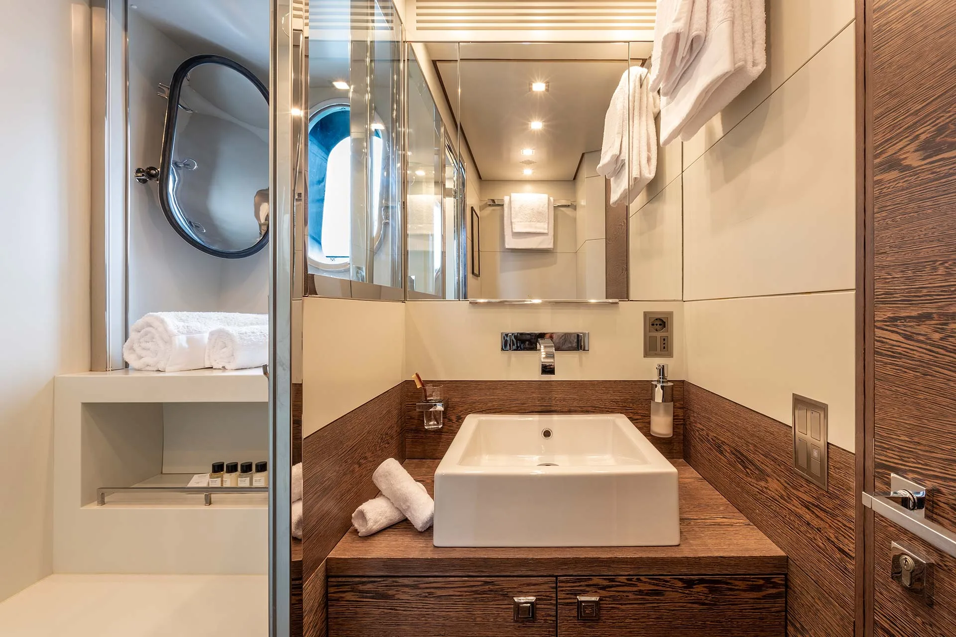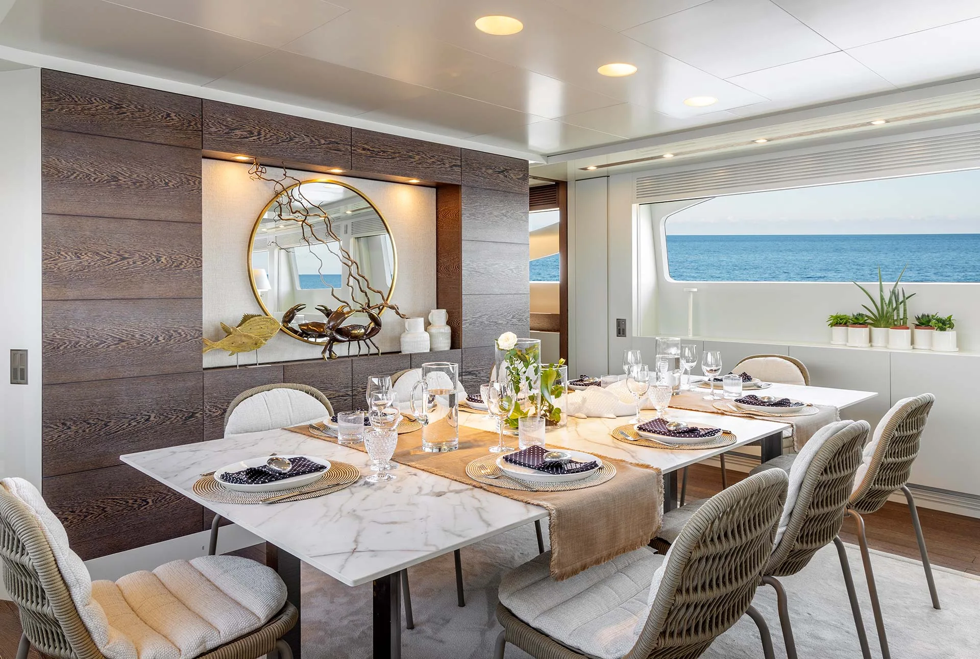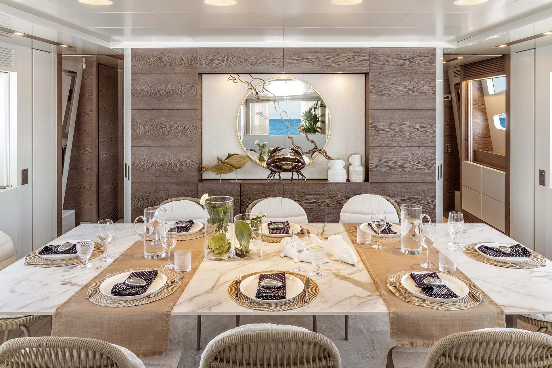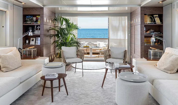 On the main deck there is a spacious galley and the aft section combines the formal dining area and main salon into one large open plan space. The formal dining area seats up to 10 guests in sophisticated monochrome surroundings.